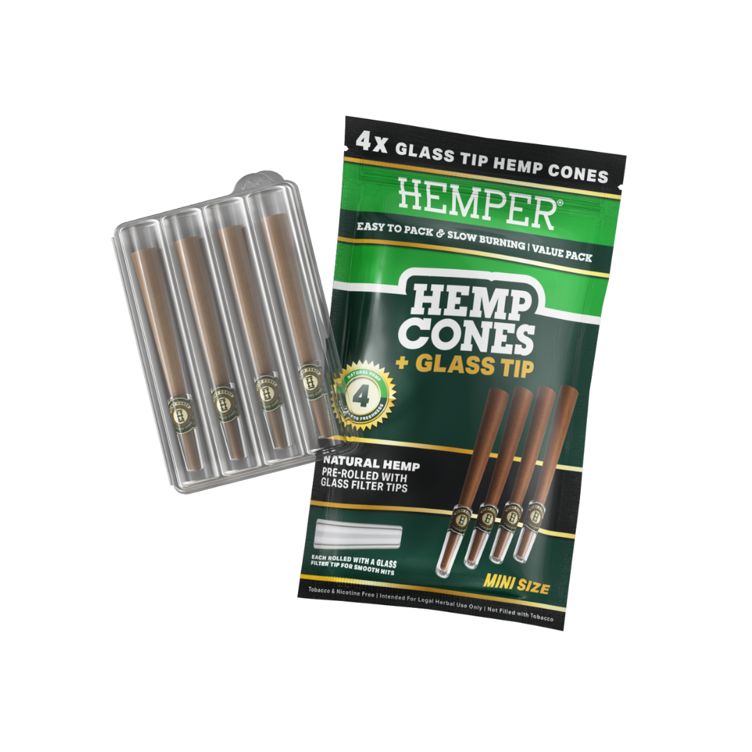HEMPER – PRE-ROLLED MINI SIZE GLASS TIPPED HEMP CONES | 4PK | NATURAL